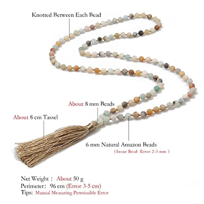 This 108 bead mala necklace features genuine matte amazonite gemstones, with each 6mm bead creating a beautiful tool for meditation and spiritual practice.