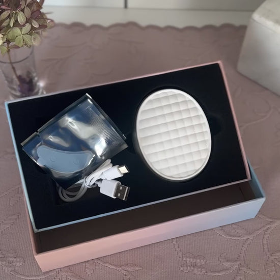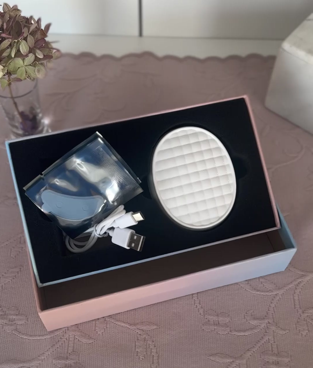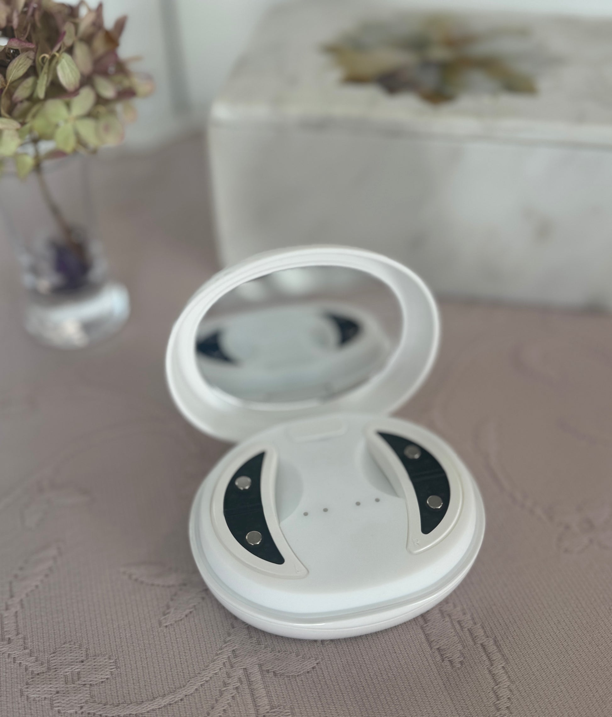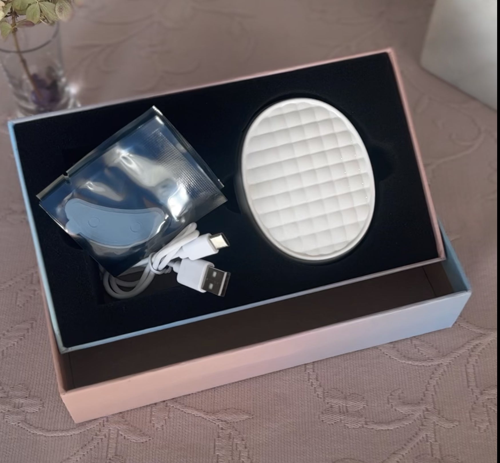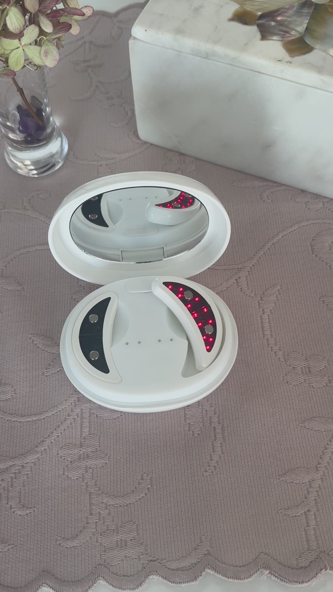 Red light therapy has been clinically shown to, after consistent daily 10 minute sessions, stimulate cellular renewal, boost collagen production, and improve circulation—delivering visible results for dark circles, puffiness, and fine lines. This innovative tool combines therapeutic red light with soothing warmth, and it is your option to add the massaging (EMS) gentle micro-current pulses for a comprehensive anti-aging treatment.
