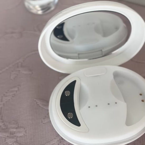 The cordless pods can be placed anywhere on the face for concentrated and targeted red light treatment with 12 lamps per pod and 2 contact points per pod to deliver E-stim current.